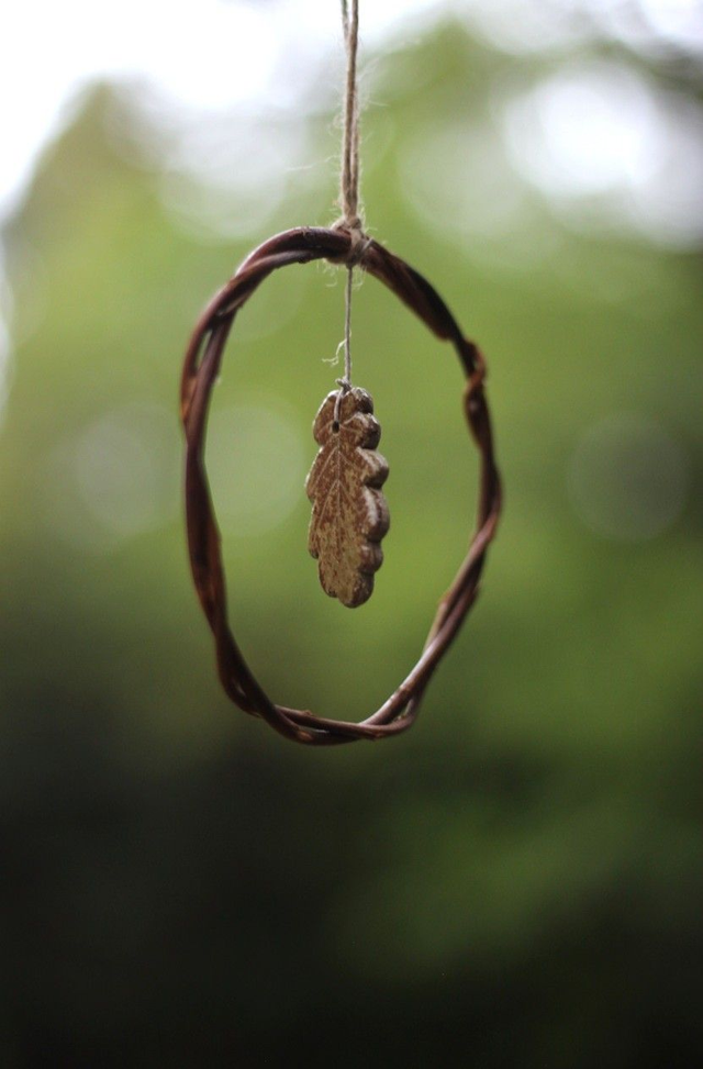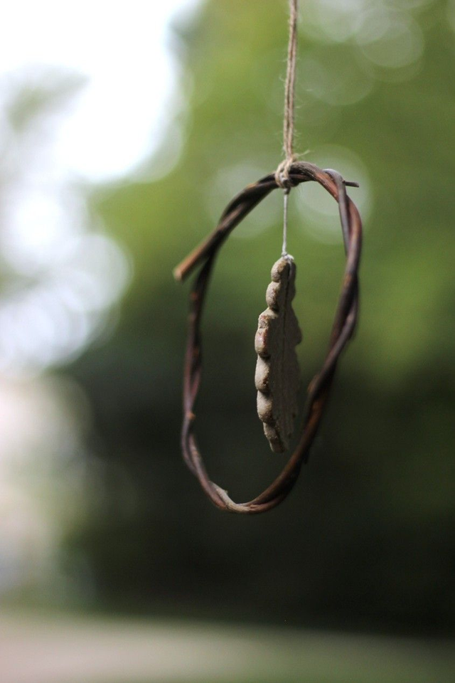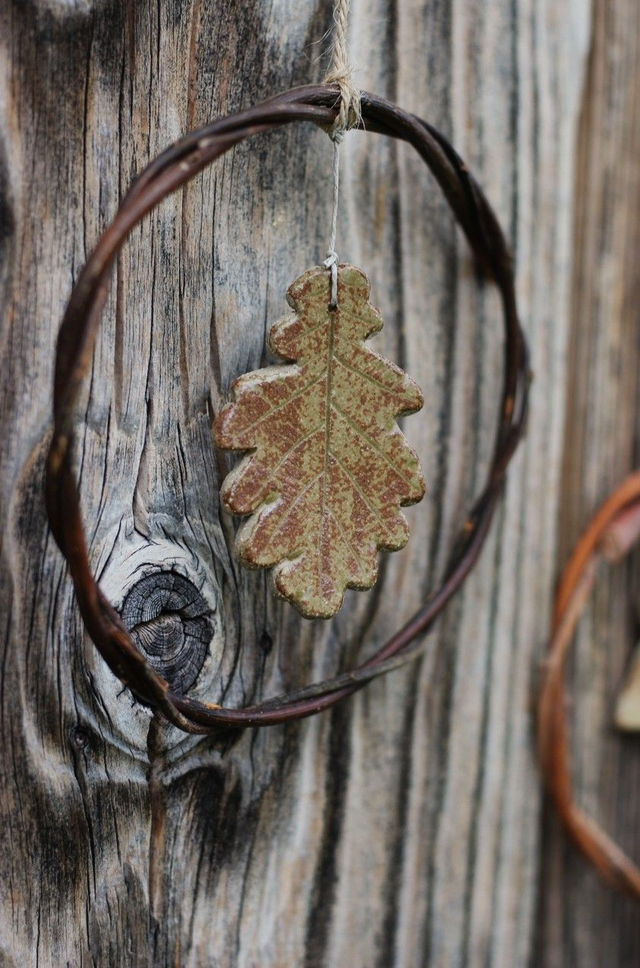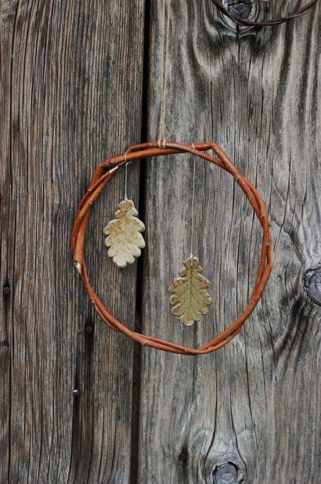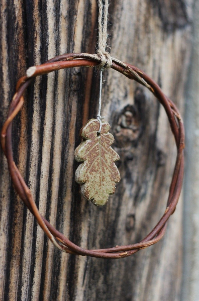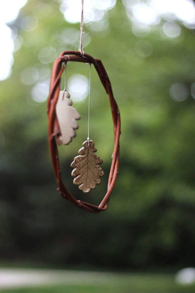3 mobiles artisanaux composés de feuilles de chêne en grès et de branchages sauvages tressés, pour accompagner la transition automnale en douceur.