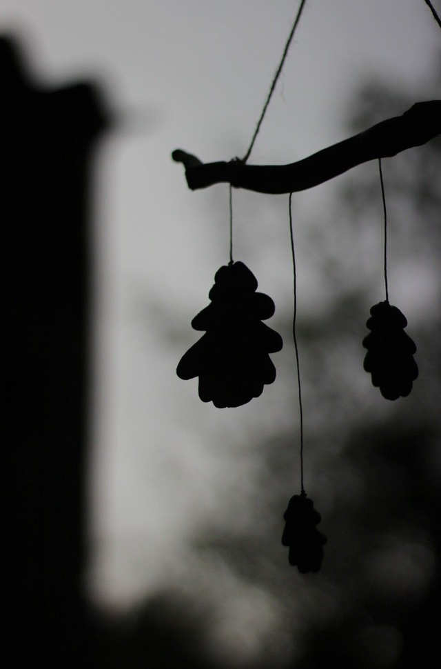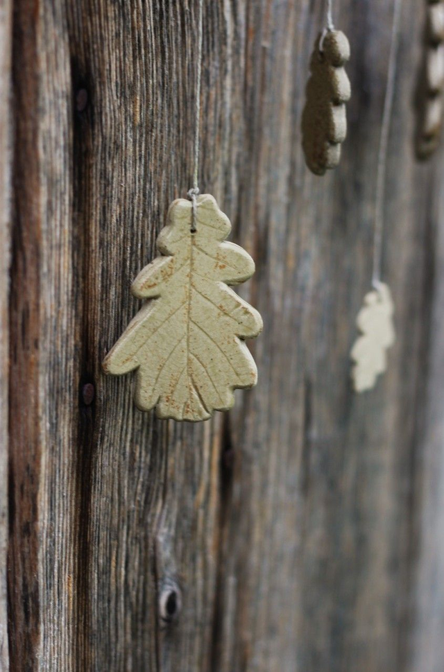 Un mobile artisanal composé de feuilles de chêne en grès et d'un branche, pour accompagner la transition automnale en douceur.