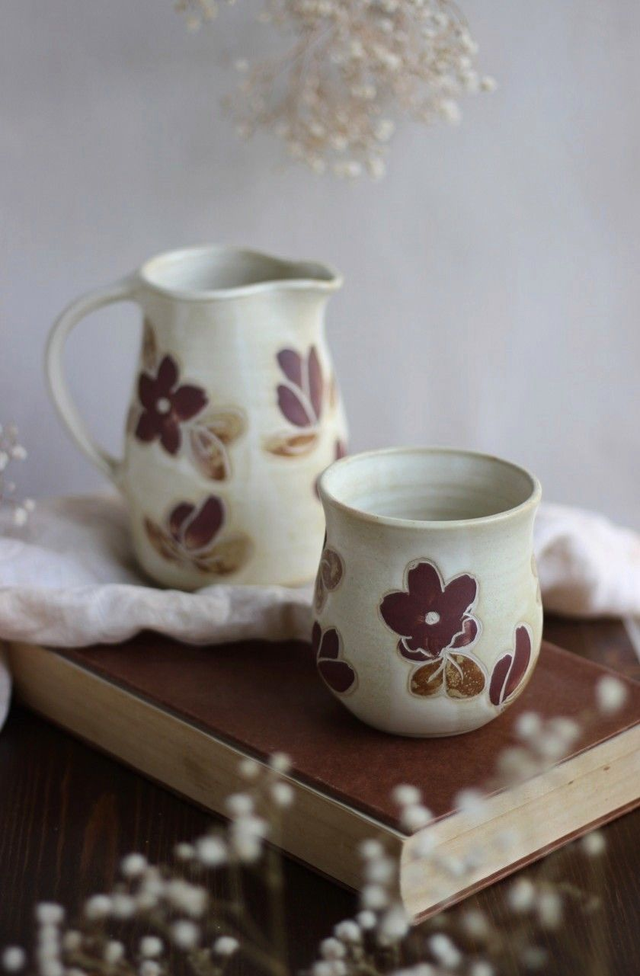 Cet émail blanc crème de ma fabrication a un toucher plutôt mate et un aspect légèrement nuageux selon l'épaisseur d'application. Les fleurs bordeaux sont peintes avec une ocre naturelle de Bourgogne et gravées à la main une par une.